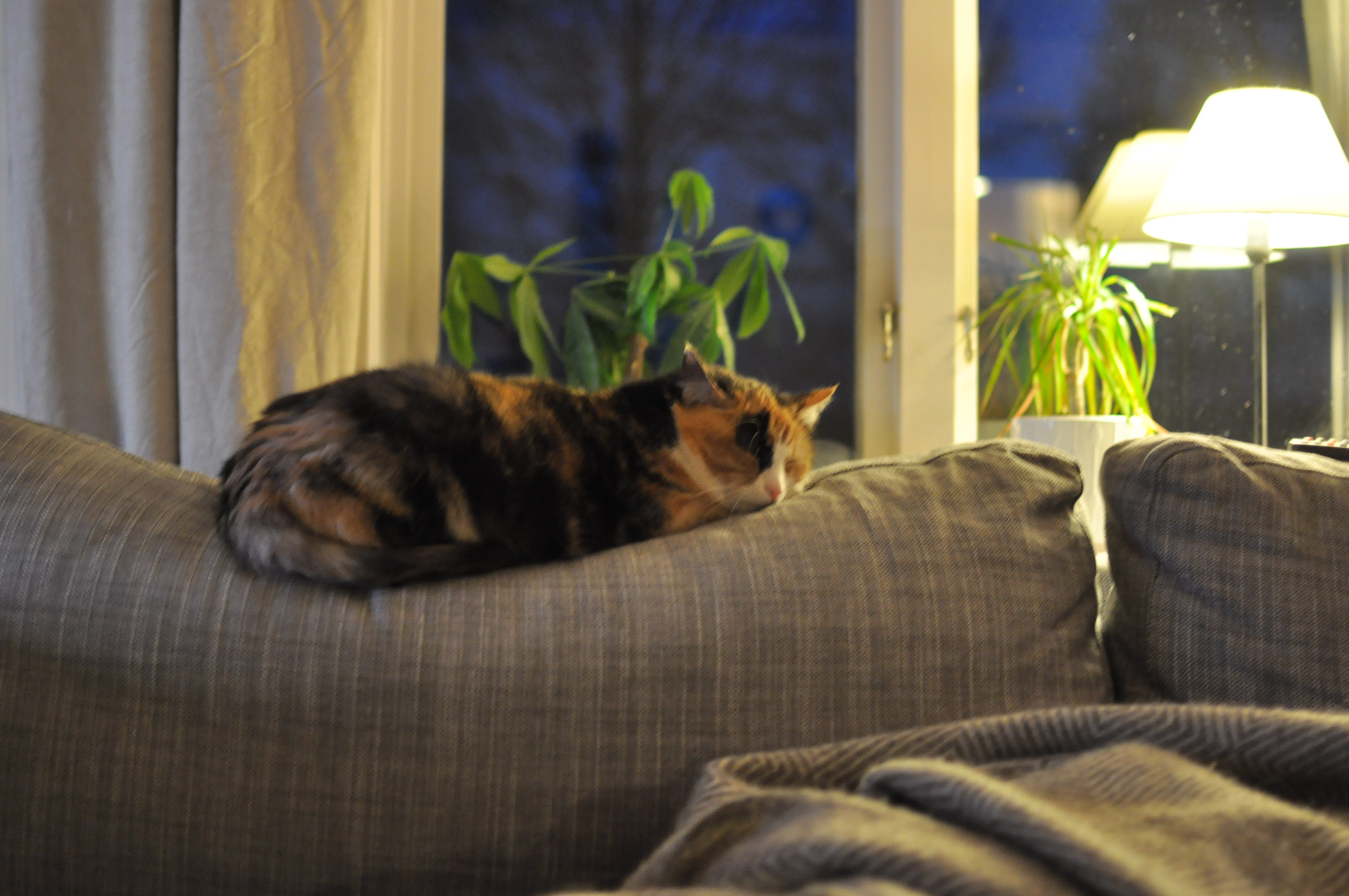 Sovplatserna här på Nybygget varierar, ena dagen är det soffan och andra dagar är det vinden. Just den här sovplatsen är helt ny för år och så länge jag inte rör kuddarna och förstör gropen så fungerar det.