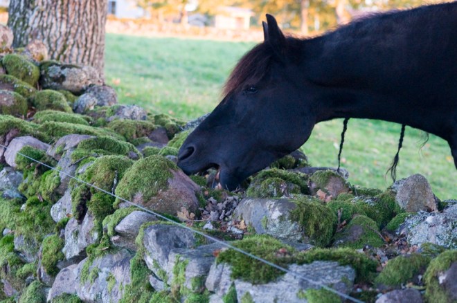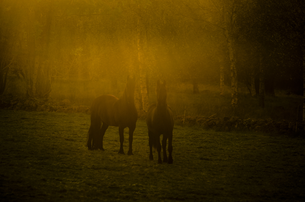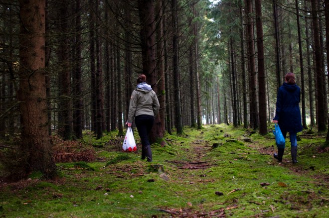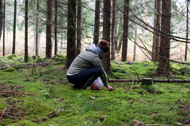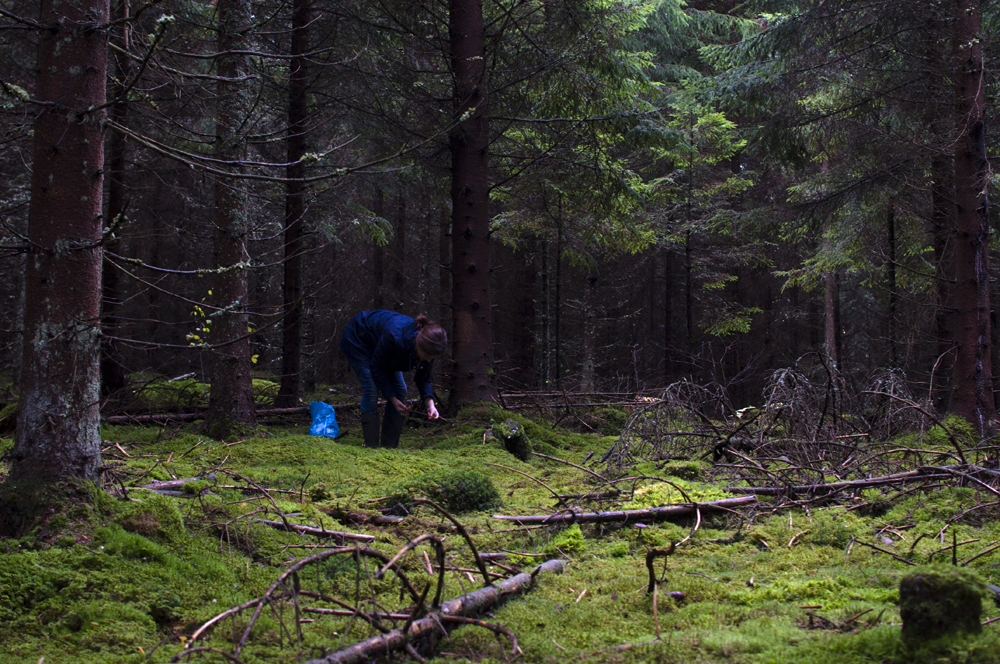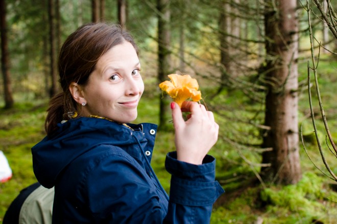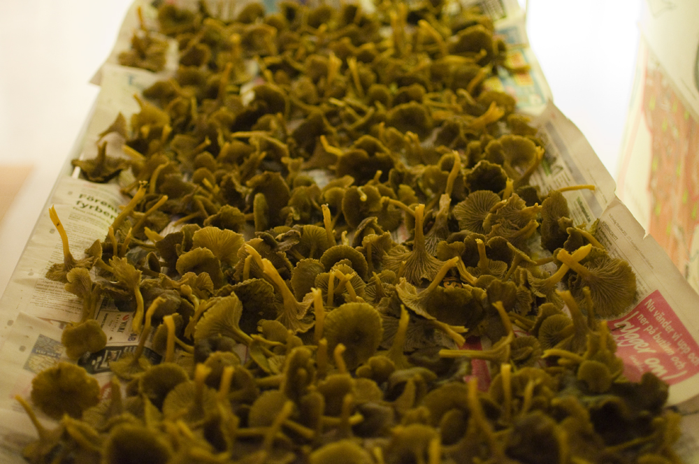 I går kom Vera och Jenny och hälsade på. Efter att ha delat en flaska Prosecco och lite mat så var det dags för en promenad i skogen. När vi kom in i den täta och trolska granskogen så sätter sig Jenny på huk för att ta en bild. Det vi sedan hör är -Här finns det Svamp! Trattkantareller hade Jenny hittat där på marken. Ja vad gör man jo man börjar plocka, Jenny blir mer och mer exalterad efter som det finns massor utav svamp. Vi har med oss ett paraply som får fungera som korg.